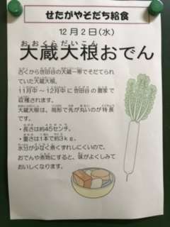 今日の給食は世田谷で育てられている大蔵大根を使ったおでんです。