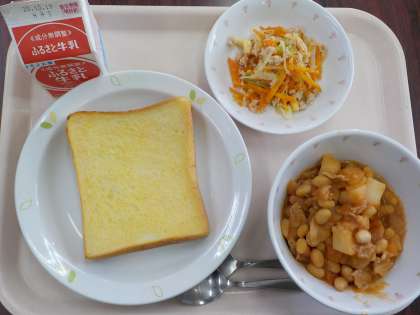 本日の給食は、フレンチトースト・ポークビーンズ・にんじんサラダ・牛乳です。