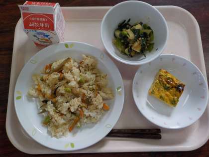 本日の給食は、かやくごはん・小松菜のそぼろあん・和風卵焼き・牛乳です。
