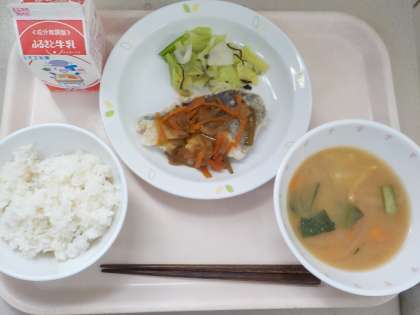 本日の給食は、麦ごはん・魚の南蛮漬・キャベツの塩昆布あえ・味噌汁・牛乳です。
