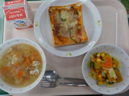 本日の給食は、ピザトースト・にんにく入りスープ・パンプキンサラダ・牛乳です。