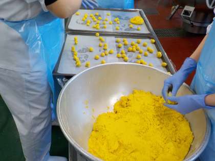 写真は、かぼちゃの団子をひとつひとつ丸めて作っているところです。