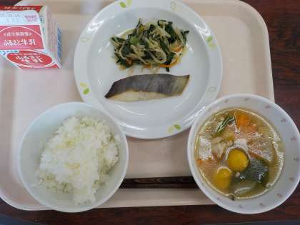 本日の給食は、ごはん・魚の西京焼き・青菜のおひたし・かぼちゃの団子汁・牛乳です。