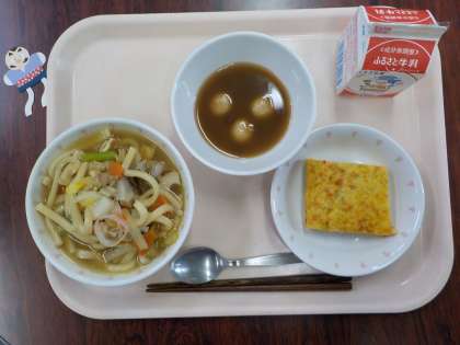 本日の給食は、ちゃんこうどん・えび入り卵焼き・白玉しるこ・牛乳です。