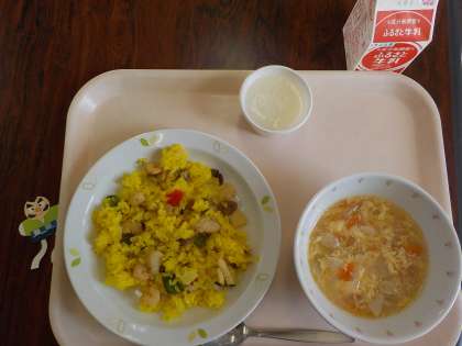 本日の給食は、パエリア・たまごスープ・ホワイトゼリー・牛乳です。