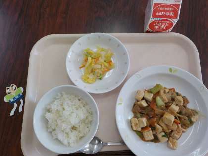 本日の給食は、麦ごはん・四川豆腐・ラーパーツァイ・牛乳です。