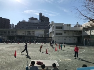 1月25日から持久走月間が始まりました。中休みに軽快な音楽にのって元気よく走っています。