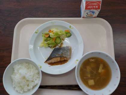 本日の給食は、ごはん・鮭のステーキソース・ひとしお野菜・みそけんちん汁・牛乳です。
