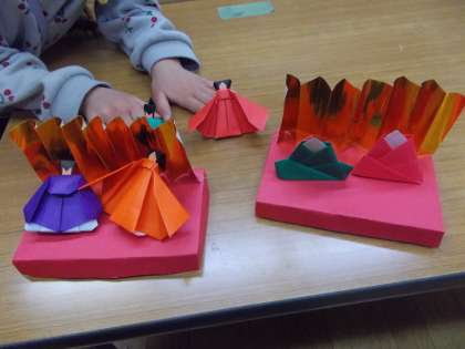 折り紙を上手に使い、ひな人形にあわせて色紙の大きさをあわせました。