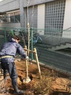 本校正門前の桜が切られてしばらく経ちますが、この度、東京三軒茶屋ライオンズクラブのご厚意により桜の木を寄贈していただきました。今日植樹が行われましたが、この木は今年度の6年生の卒業記念として植えていただいたものです。卒業してゆく6年生と同様、大きく育ってほしいものです。