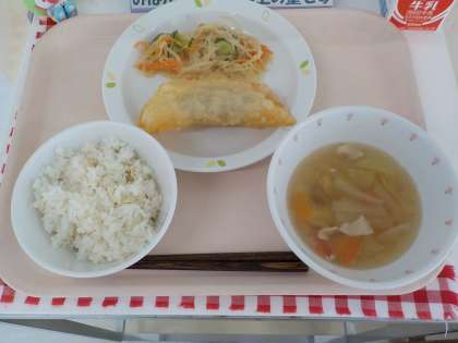 本日の給食は、麦ごはん・ジャンボ餃子・春雨サラダ・白菜スープ・牛乳です。
