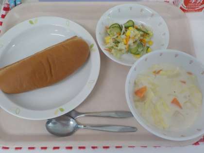 本日の給食は、黒砂糖パン・マカロニのクリーム煮・フレンチサラダ・牛乳です。