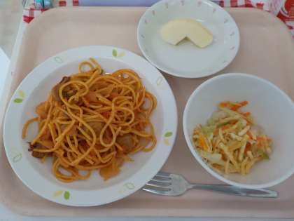 本日の給食は、スパゲッティナポリタン・じゃがいものハニーサラダ・りんご・牛乳です。
