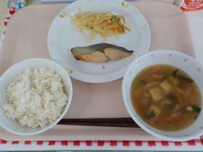 本日の給食は、麦ごはん・魚の西京焼き・大根サラダ(おはなし給食)・吉野汁・牛乳です。
