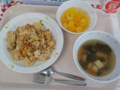 本日の給食は、キムチチャーハン・わかめスープ・フルーツポンチ・牛乳です。