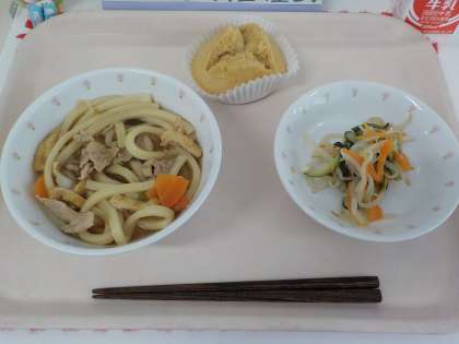 本日の給食は、煮込みうどん・みそドレサラダ・きなこ蒸しパン・牛乳です。
