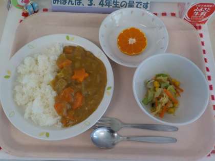本日の給食は、三宿カレーライス・カラフルサラダ・菊花みかん・牛乳です。