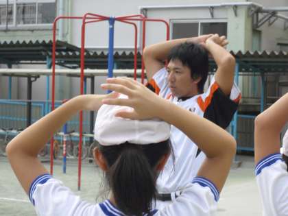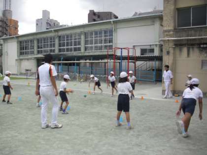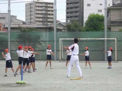 学校公開初日、中学年は読売巨人軍の講師を招いてティーボール教室を行いました。