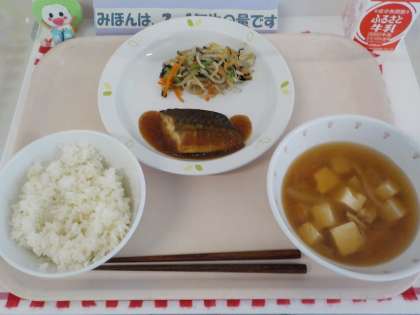 本日の給食は、麦ごはん・さばの黒酢ソースかけ・野菜ののりあえ・味噌汁・牛乳です。