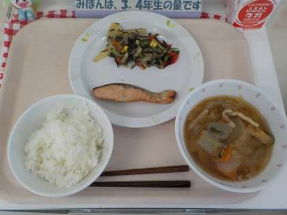 本日の給食は、ごはん・魚のてりやき・大根とひじきのサラダ・豚汁・牛乳です。