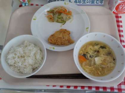 本日の給食は、麦ごはん・鶏肉のから揚げ・こんにゃくサラダ・かき玉汁・牛乳です。