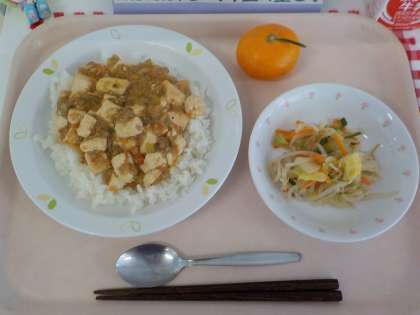 本日の給食は、麻婆豆腐丼・白菜の中華サラダ・みかん・牛乳です。