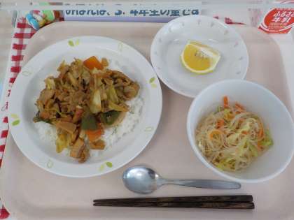 本日の給食は、ホイコーロー丼・春雨サラダ・はるか・牛乳です。