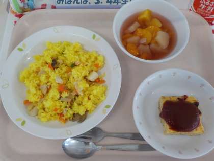 本日の給食は、パエリア・スペイン風オムレツ・サングリア風フルーツポンチ・牛乳です。