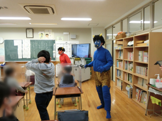 今日は節分です。わかば学級では自分自身の弱いこころ、「こころの鬼」をやっつけようと授業をしていました。突然ホンモノの赤鬼と青鬼がやってきたので、みんなで豆を投げて退治しました。