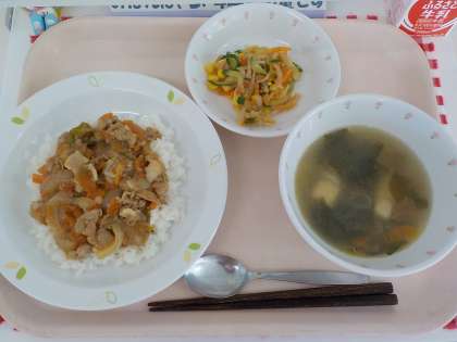 本日の給食は、スタミナ丼・切干大根のサラダ・わかめスープ・牛乳です。