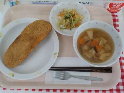 本日の給食は、きなこ揚げパン・肉団子入り春雨スープ・中華サラダ・牛乳です。