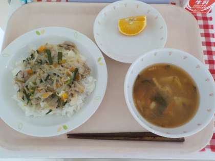 本日の給食は、ねぎ塩豚丼・味噌汁・甘夏・牛乳です。
