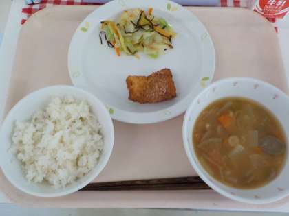 本日の給食は、むぎごはん・いかのさらさ揚げ・キャベツの塩昆布かけ・呉汁・牛乳です。