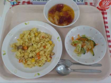 本日の給食は、いろどりピラフ・玉ねぎドレッシングサラダ・あじさいポンチ・牛乳です。
