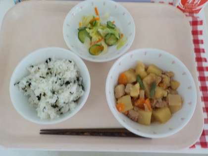 本日の給食は、わかめごはん・肉じゃがうまに・ひとしお野菜・牛乳です。