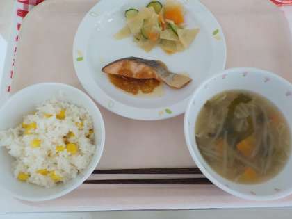 本日の給食は、とうもろこしごはん・魚のステーキソース・シャキシャキ野菜・わかめともやしのスープ・牛乳です。