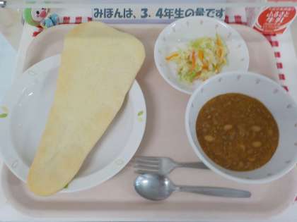 本日の給食は、ナン・キーマカレー・コールスロー・牛乳です。