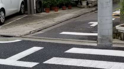 学校の東門前の横断歩道です。この道は、登校時間内は、246から車がこれないように、しています。自転車については、とおれます。