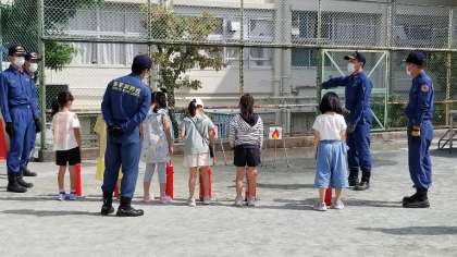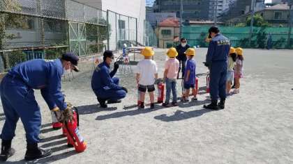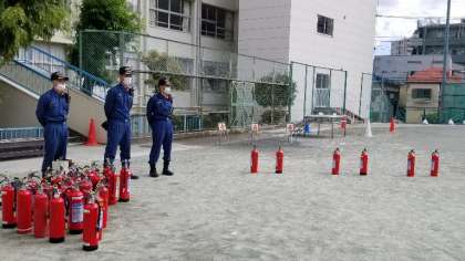 1年生、2年生、わかば学級が消火器訓練を行いました。実際の火事に遭遇した場合は、大人に知らせることを指導しています。