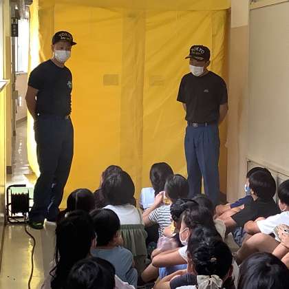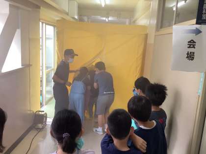 煙中訓練にドキドキ。想像以上に前が見えず、前に進むのも大変でした。