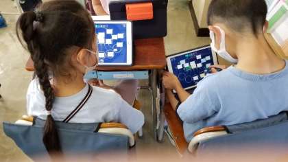 国語の話し合いの様子です。グループで、タブレットにメモしながら話し合いをすすめています。