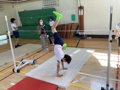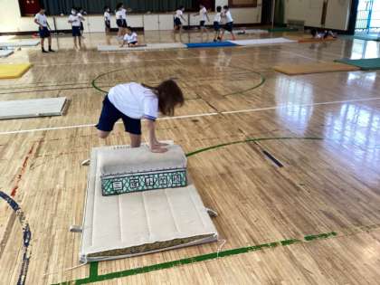 体育のマット運動です。技を磨くため、場の工夫を自分たちで考え、課題解決を目指しています。