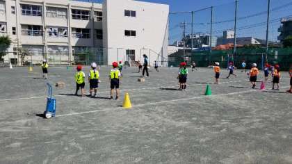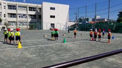 晴天の中、1年生が、元気に体育の授業に参加しています。子どもたちが自分たちで、道具の準備をしています。