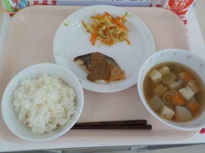 本日の給食は、ごはん・魚のごまだれかけ・やさいのしょうがじょうゆ・けんちん汁・牛乳です。