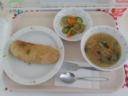 本日の給食は、きなこ揚げパン・春雨スープ・シャキシャキ野菜・牛乳です。