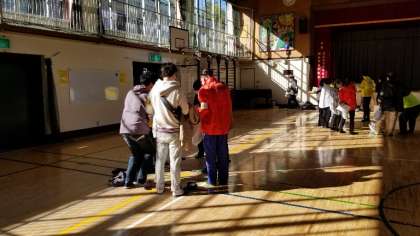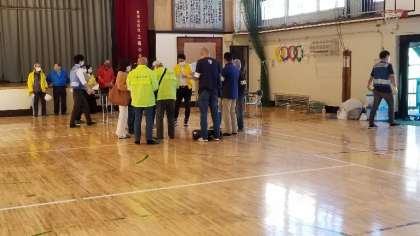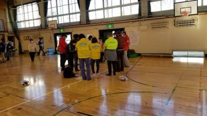 避難所を立ち上げるために、4つの班に分かれて作業を行います。各班ごとに打ち合わせを行っています。