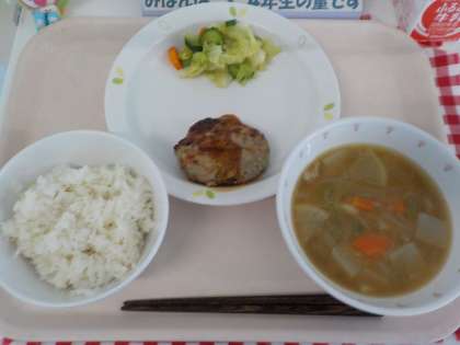 本日の給食は、むぎごはん・かみかみハンバーグ・野菜のぽりぽりつけもの・ごろごろやさいの豚汁・牛乳です。