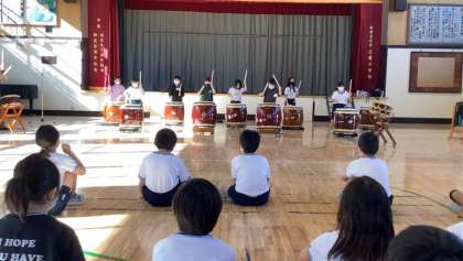 こども劇場せたがやの様子です。プロの演奏を聴き、実際に和太鼓体験をしました。とても楽しそうにリズムよく太鼓を叩き、授業の最後には1曲を完璧に叩くことができました。