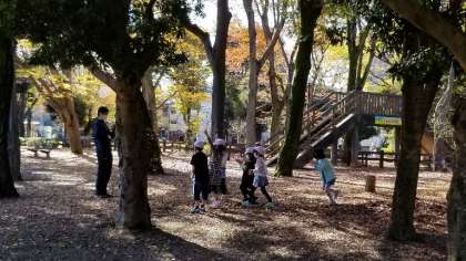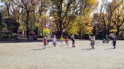 インタビューを終えました。2年生が、元気いっぱい遊んでいます。お天気もよく、気持ちのいい時間を過ごしています。