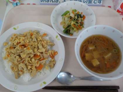 本日の給食は、親子丼・おひたし・切干大根の味噌汁・牛乳です。